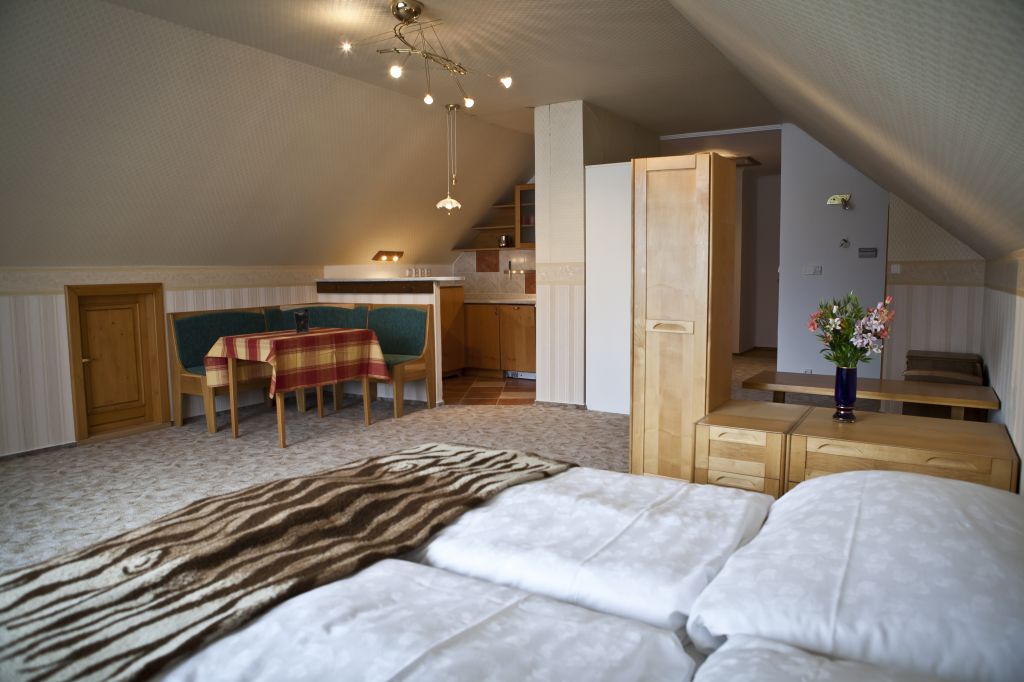 V apartmáne situovanom na vrchnom poschodí Vily ponúkame pre Vás dve spálne s manželskou posteľou, možnosťou prísteľky a samostatnou kúpelňou. K dispozícií je obývacia miestnosť, kuchyňa, ako aj lyžiareň na skladovanie a sušenie lyžiarskej výbavy v zime.
